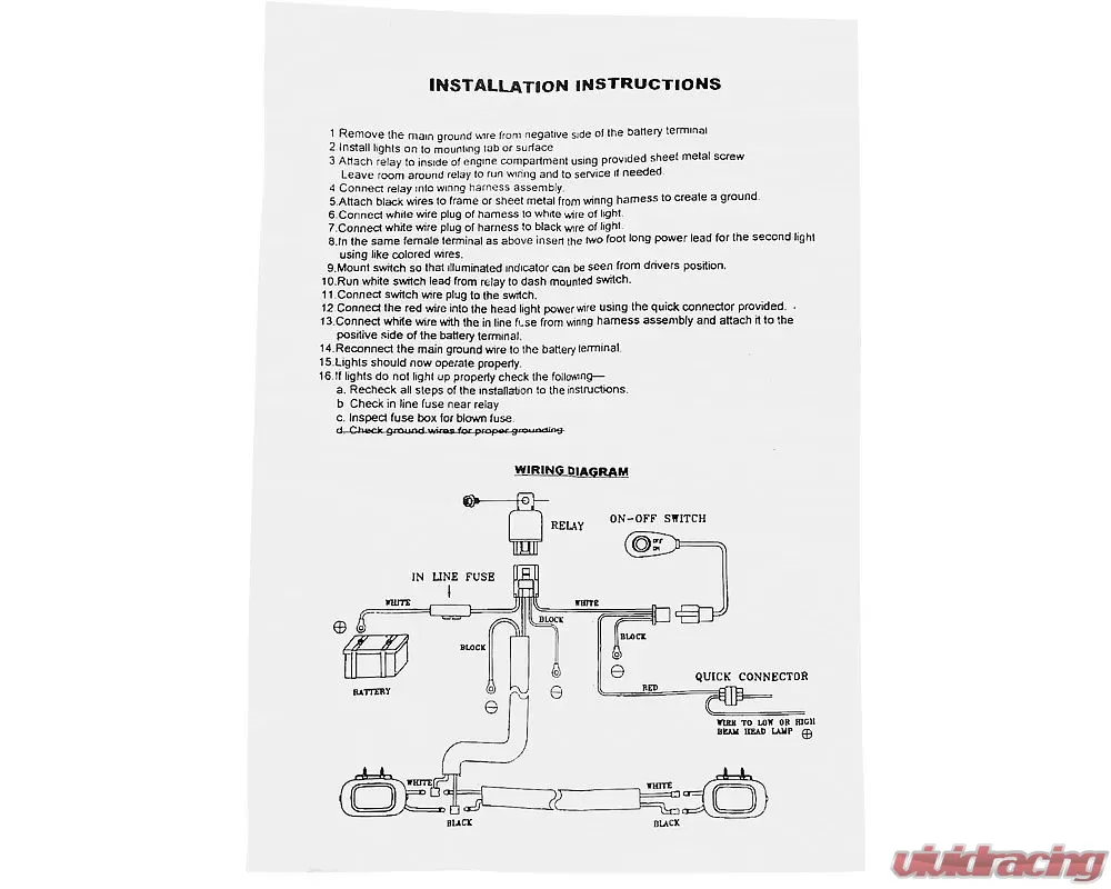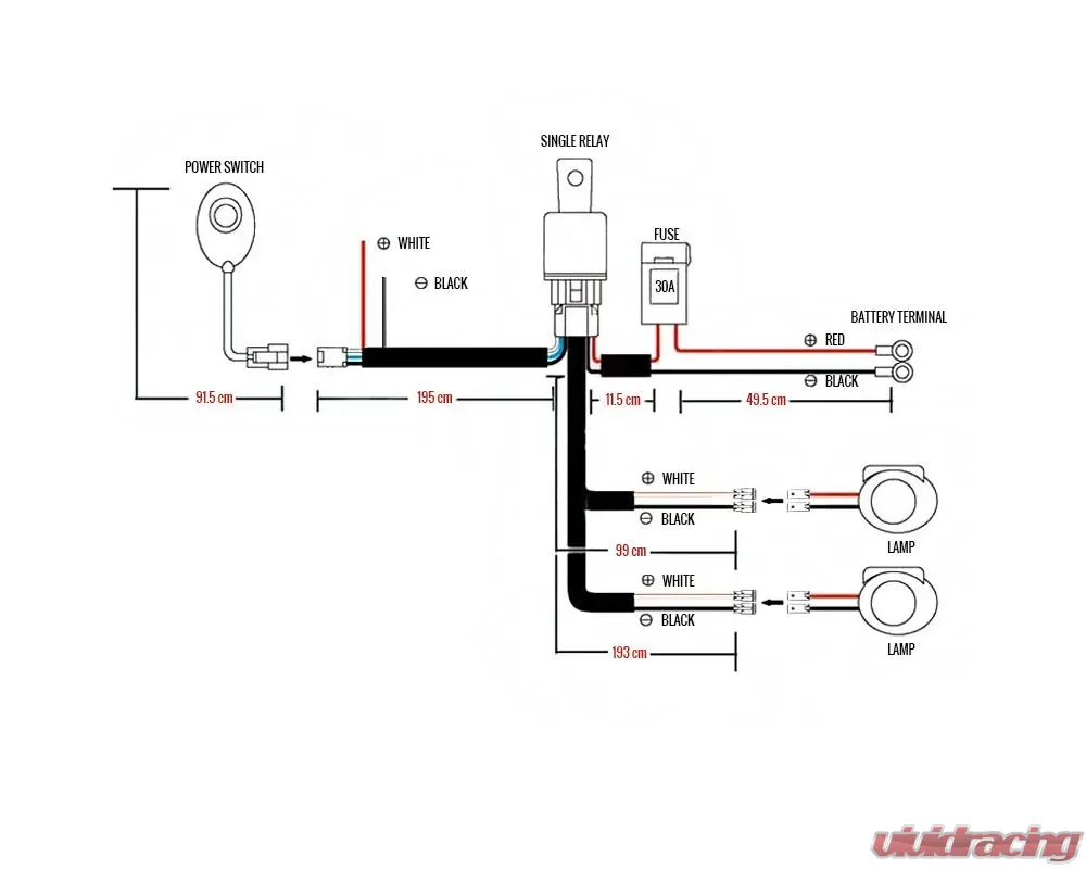 - This kit included: 1 set of full 16 gauge wiring harness, 1 pre-install on/off switch, 1 piece dual relay, fuse and print connectors