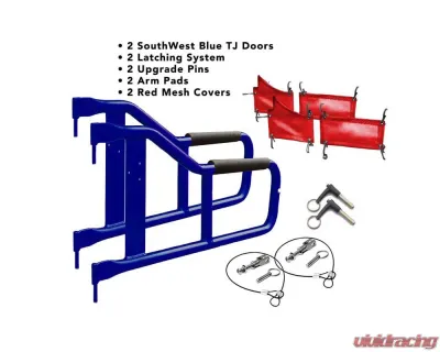 • TJ Door Kit - Southwest Blue Doors Red Mesh. Made in the USA.