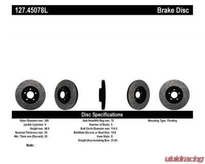 The 127.45078L rotors are engineered to improve upon factory components. The unique cross-drilling and slotting design aids in heat dissipation and brake dust dispersal, which helps prevent glazing of the pads. This means you'll experience better bite and improved performance in both wet and dry conditions. Whether you're navigating city streets or tackling winding roads, these rotors will provide the reliability and responsiveness you need.