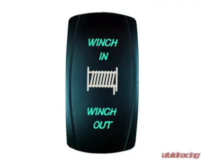 STV Motorsports Momentary Winch In/Out Laser Rocker Switch. All symbols are laser etched directly onto the switch face to ensure long image life.