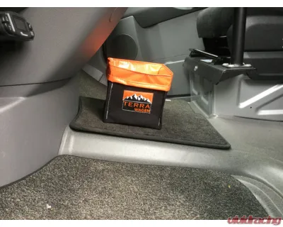 You can never have enough storage in your Sprinter. We needed a place to store charging cables, USB chargers, sunglasses, and other small items. We had these made locally by Beckel canvas. Black canvas outer, orange or grey vinyl inner that can come out to wash if needed. We've never been able to loose it, even on the roughest terrain.