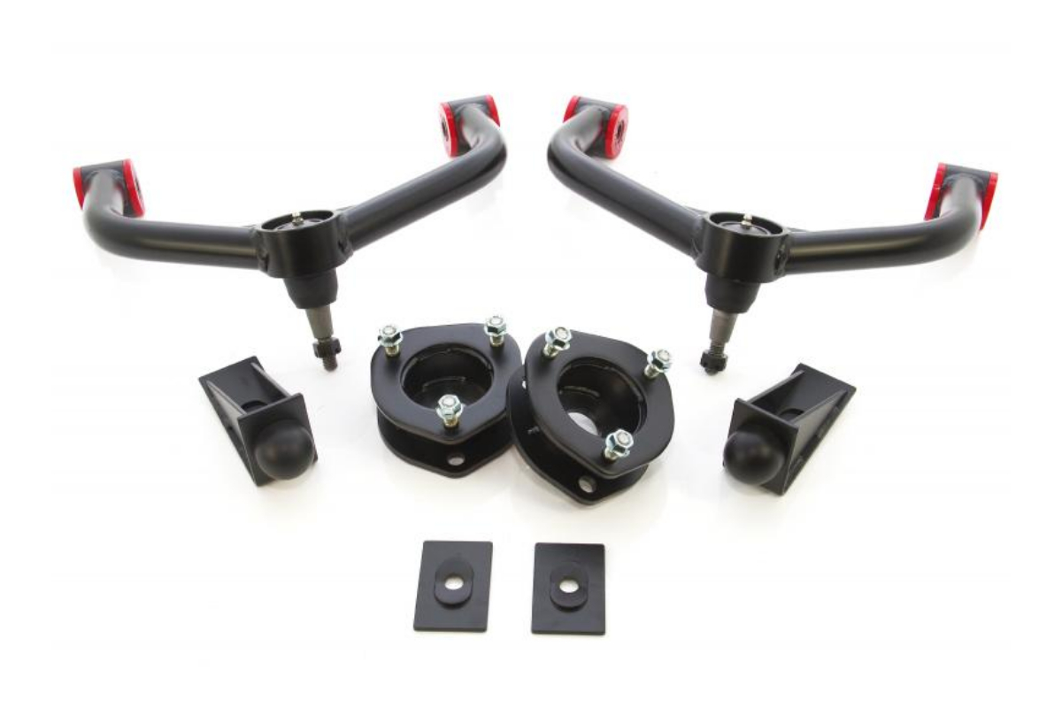 The ReadyLift leveling kit for the RAM 1500 proves that you do not need to break the bank in order to get a quality suspension system. It is the fastest, safest, and most cost-effective way to bring the front end of your pick-up truck level with the rear. ReadyLift’s 2.5-inch premier leveling kit features Smart Strut Technology mounts on top of the strut, unlike urethane spacer kits that compress the spring and deteriorate as time goes by. To prevent premature CV joint wear and damage, ReadyLift uses custom bump stop brackets to limit the downward suspension travel. This particular kit also comes with ReadyLift’s superior Tubular Upper Control Arms which alleviate the common issue of the factory ball joints falling out of the stock control arms. The ReadyLift 2.5-inch leveling kit with upper control arms is the perfect combination for those looking to safely level their RAM 1500 while avoiding OE ball joint problems.