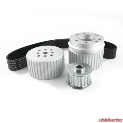 Gilmer pulleys are a great solution for any racing set-up. They eliminate the problem of slippage and disengagement you'd experience at high RPM with a v-belt. Each TSP Gilmer kit comes with pulleys for the crank, water pump, and alternator, and A 1.5" wide belt. Regardless of application, TSP's Gilmer style pulley kit is an efficient and lightweight option for your high-performance engine.