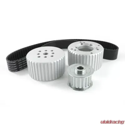 Gilmer pulleys are a great solution for any racing set-up. They eliminate the problem of slippage and disengagement you'd experience at high RPM with a v-belt. Each TSP Gilmer kit comes with pulleys for the crank, water pump, and alternator, and A 1.5" wide belt. Regardless of application, TSP's Gilmer style pulley kit is an efficient and lightweight option for your high-performance engine.