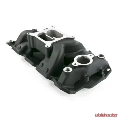 TSP's dual-plane air gap intake manifold for the small block Chevy is ideal for high-performance applications. Its improved design is complimented by an open area under the plenum. This feature ensures less heat transfer from the engine, meaning the air/fuel charge will be cooler and produce more power and torque. Producing power and torque comparable to single-plane manifolds, it improves driveability and throttle response like other dual-planes and performs best between 1,500 and 6,500 rpm. It is cast from lightweight aluminum and features a relatively low profile for great hood clearance. Additional provisions include dual distributor hold-downs, 4 corner water ports, nitrous bosses and a square bore carburetor flange.