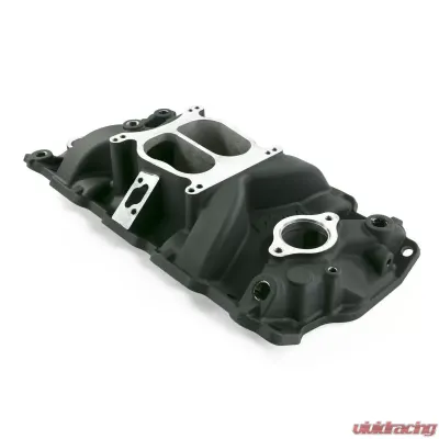 TSP's dual-plane high-performance intake manifold for the small block Chevy is ideal for street performance applications. With a design that improves throttle response, as well as power and torque over a wide rpm range - idle to 5,500. It is cast from lightweight aluminum and features a low profile for ideal hood clearance. Additional provisions include dual distributor hold-downs, 4 corner water ports, and a choke block-off kit. Set up for spread bore carbs, this manifold comes with an adapter plate and gasket for use with square bore types.