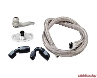Torque Solution -10AN Turbo Oil Return Line Kit is the perfect solution for making a custom -10AN oil return for your rotated turbo kit. Our head fitting is made from CNC stainless steel w/ high temp o-rings to ensure a leak free seal. Using our kit is the perfect choice for a kink free and proper sized oil return for your rotated turbo setup ensuring proper oil flow back to the motor. Simply pull out the OEM return tube on the head and bolt our fitting in its place.