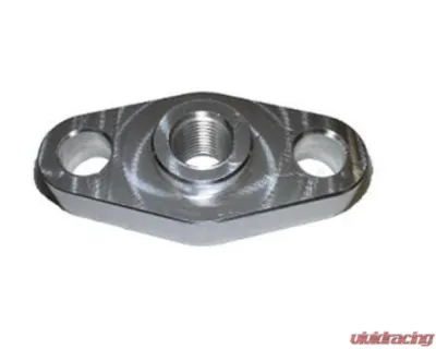 Billet aluminum oil feed flange for T3, T3/T4, or T04 aka T4 or To4 (also GT40R and GT42, GT42R, GT42RS) turbochargers that do not have a threaded 1/8" NPT hole on the oil inlet side. Designed to be bolted to turbo with two 8mm thread x 1.25 pitch bolts. 1.5" bolt center to bolt center spacing.