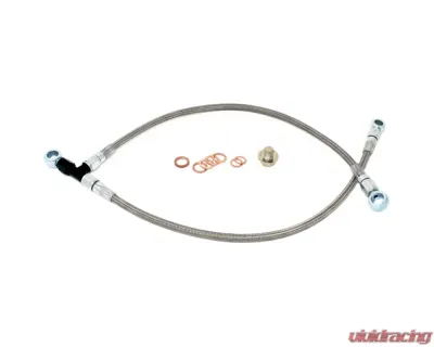 Torque Solution turbo Oil feed Line kit for Subaru EJ stock location configurations. The OEM oil feed hard lines are fragile and are easily damaged when swapping or working on your turbo. Our kit converts the hard lines to stainless steel braided -4an lines w/ T Fitting and provides all the necessary banjo fittings / copper washers to complete the job.