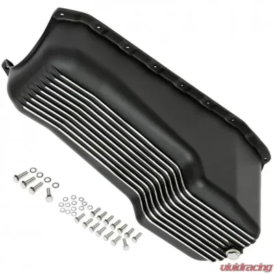 BLACK Aluminum FINNED, OEM-Style Engine Oil Pan With Bolts; 1980-85 SB Chevy 305-350; 4 Qt Capacity.