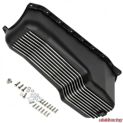 BLACK Aluminum FINNED, OEM-Style Engine Oil Pan With Bolts; 1986-00 SB Chevy 305-350; 4 Qt Capacity.