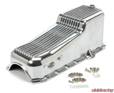 This finned-style, cast aluminum oil pan from Trans-Dapt Performance has a classic design that will never go out of style. It easily bolts on to 1980-85 SB Chevy 305-350 (5.0 / 5.7L) engines with a 2-Piece rear main seal (for 1986-00 engines with 1-piece rear main seal use Trans-Dapt oil pan #9022), and passenger side dipstick. Precision cast from aluminum, the pan is hand polished to a bright shine, and will complement any engine dressed-up with Trans-Dapt's other quality aluminum engine accessories (i.e. valve covers, air cleaner, water neck, etc.). Install the pan right out of the box, or have the fin recesses painted to color match the vehicle's paint. Gaskets, bolts and pick-up (uses stock oil pickup) not included.