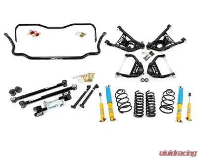 Since its introduction, UMI's Stage 3 kit has been the choice for GM A-body owners looking to achieve great street manners combined with Pro-Touring handling capability. In this newest revision we've refined our parts list to provide the most common options in one convenient package. Simply click and enjoy the performance. Up front you'll find Delrin lower a-arm bushings for precise steering along with ??" taller upper ball joints to plant that tires contact patch. Out back we include our popular Roto-Joints and an adjustable length upper control arm so the axle can articulate nicely after you've perfected the driveline angle. Sway bars are UMI's tried and true 1-1/4" front and 1" rear for a great front to rear handling balance. We are especially proud to introduce our own ultra-premium springs built from CrSi wire and featuring 530 lb/in front and 130 lb/in linear rates. These carefully selected rates help your car split the difference between a comfortable ride and awesome handling. And what better to control the UMI springs than UMI's hot new SP series monotube shocks. The kit is available in beautiful red or black powder coat and is 100% designed, tested, manufactured and raced out of our shop in Philipsburg, PA - USA.