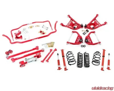 Since its introduction, UMI's Stage 3 kit has been the choice for GM A-body owners looking to achieve great street manners combined with Pro-Touring handling capability. In this newest revision we've refined our parts list to provide the most common options in one convenient package. Simply click and enjoy the performance. Up front you'll find Delrin lower a-arm bushings for precise steering along with ??" taller upper ball joints to plant that tires contact patch. Out back we include our popular Roto-Joints and an adjustable length upper control arm so the axle can articulate nicely after you've perfected the driveline angle. Sway bars are UMI's tried and true 1-1/4" front and 1" rear for a great front to rear handling balance. We are especially proud to introduce our own ultra-premium springs built from CrSi wire and featuring 530 lb/in front and 130 lb/in linear rates. These carefully selected rates help your car split the difference between a comfortable ride and awesome handling. And what better to control the UMI springs than UMI's hot new SP series monotube shocks. The kit is available in beautiful red or black powder coat and is 100% designed, tested, manufactured and raced out of our shop in Philipsburg, PA - USA.