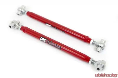 UMI P/N 2017, double adjustable control arms are designed for race applications and light duty street use. The spherical rod ends offer a solid foundation and work excellent as a solid bushing control arm while eliminating rear suspension bind. The double adjustment allows easy on car changes for wider tire clearance and to center aftermarket rear ends. These race application control arms are manufactured from DOM steel tubing or optional 4130 CrMo and are TIG welded for the utmost in strength. The premium Teflon lined rod ends attach to the control arms using in-house machined 4130 CrMo tube adaptors. UMI P/N 2017 allows adjustments of 1 longer or 1 shorter and are supplied pre-set to factory length. These race style control arms are designed for aftermarket sway bars that do not attach to the control arms; control arms are supplied with no sway bar holes.