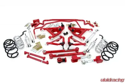 Who says you can't have it all? UMI's Stage 4 kit transforms your G-Body into a handling machine with the adjustability to perform well at the strip or haul your family comfortably - to the autocross. If drag racing is more your style, a few minor changes at initial purchase (or down the road) will have you launching with the best of them, then canyon carving on the way home! Up front we start with UMI's proven upper and lower tubular a-arms loaded with ??????????? taller upper and lower ball joints giving you a total of 1" increased spindle height. The adjustable upper a-arms increase caster, without additional shims, for a precise steering feel. The lower a-arms are loaded with UMI-built Delrin bushings for smooth non-binding motion and precise steering. Viking's new front hybrid coilover with double adjustable shock allows ride height, compression and rebound adjustment. The ride height adjustment is accomplished with the included spanner wrenches and thrust washers. The compression and rebound adjusters are clicked by hand (no tools!) and feature a total of 361 possible valving combinations. The front is completed by UMI????????s 1.250??????? CrMo handling sway bar. Out back we stiffen the chassis with adjustable tubular frame braces which stabilize the Poly/Roto combo lower trailing arms and fully adjustable Roto-Joint upper control arms. 1??????? or 2??????? lowering rear springs are controlled by Viking????????s double adjustable rear shocks, once again featuring 361 possible combinations. Rounding out the rear is our Pro-Tour style rear sway bar. This 3-way adjustable bar features 1??????? tubular construction, race style end links and UMI????????s proven CNC machined clamping system. One bar allows street, road race, auto-x and drag settings. As always, this kit features UMI????????s quality red or black powder coat and premium hardware. All UMI components are manufactured with pride in Philipsburg, PA ???????? USA.