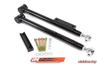 UMI Performance extended length control arms are designed to properly center the rear wheels in the vehicles wheel well on the Impala SS. These control arms are extended 5/8????? but also feature additional adjustment to perfectly center the rear end. The adjustment allows the user to lengthen or shorten the control arms an additional ??????? beyond the already extended 5/8 of an inch. The control arms are built from 1.500????? DOM tubing and fully TIG welded for the utmost in strength. Control arms also feature the correct provisions for adding a stock or aftermarket sway bar. The provided sway bar holes are reinforced with a 0.120????? all thickness steel sleeve TIG welded and sanded in place. The sway bar attaches to the control arms using a billet aluminum spacer contoured correctly to follow shape of the round tubing and properly attach the sway bar to the control arms in the factory location. The control arms attach to the rear end using spherical bearing rod ends which operate for a bind free operation when high handling is a concern. This set-up allows the suspension to articulate correctly while the polyurethane end bolts to the chassis to absorb unwanted road noise. NOTE: In some cases, depending on ride height variation, it may be necessary to install a longer driveshaft when using extended length control arms.