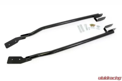 The first and only 2-point tubular bolt-in subframe connector is now available from UMI Performance. This set up is designed to tie the front and rear subframes together using bolt-in hardware supplied and requires no welding! Subframe connectors improve your car's handling ability while reducing t-top squeaks, dash rattles and quarter panel flexing, designed for auto-cross, road race as well as drag race set-ups. By connecting the front and rear subframes together this allows better weight transfer for improved traction and straighter launches. This set-up tucks tight against the floor using strong DOM tubing, causes no ground clearance loss and can not be seen from the side of the vehicle.