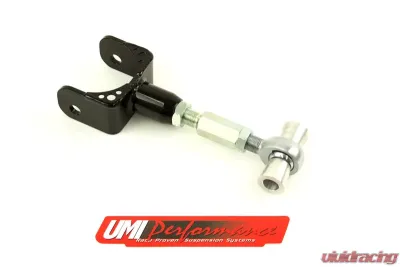 Harness the power of your new Ford Mustang with a UMI Performance P/N 1066 adjustable rear upper control arm. Upgrade from the flimsy, factory rubber bushing setup to improve responsiveness and reduce wheel hop upon launching. The robust bracket is constructed from CNC machined 0.250 thick mild steel and reinforced with three-hole gussets for incredible strength. The 4140 CrMo adjustment boss and hex adjuster is built in-house so we can control the quality. Premium rod ends allow for smooth articulation without the binding associated with the factory rubber bushings. The P/N 1066, with its on-car adjustability, allows you to easily set pinion angle for drag racing applications or correct pinion angle to compensate for vehicle lowering. The beautiful red or black powder coated P/N 1066 uses factory hardware which allows you to bolt them on and go. Proudly designed and fabricated in Philipsburg, PA USA.