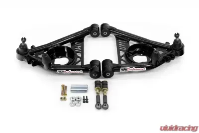 UMI lower A-Arms are fabricated from USA DOM tubing with CNC notched tube ends for a precision fit. They are jig built to maintain accuracy and bolt on correctly every time. All critical areas are TIG welded for superior strength and a clean look. UMI's lower A-Arms also feature improved ball joint angle for lowered vehicles and the design provides additional tire clearance. UMI P/N 3031 lower a-arms include greaseable fluted polyurethane bushings for a smooth quiet ride. They come preloaded with polyurethane bump stops, steering stops and premium ball joints. UMI's extensive testing on the street, drag strip and skid pad ensures a quality product able to with stand all types of abuse. UMI lower A-Arms are designed to work with factory springs, lowering springs and most coil over kits without changing the a-arms. For exceptional handling and performance we recommend combining with UMI upper a-arms, part # 3033-2. UMI's lower a-arms are shipped fully assembled and ready for installation. Designed and manufactured with pride in Philipsburg, PA - USA.