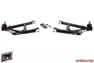 UMI's Corner Max line of race a-arms are designed from the ground up to be the best performing stock mount a-arm upgrade on the market. The P/N 4062 arms are strong yet lightweight and feature a removable lower mounting system to permit spring changes at the track without separating the ball joints. The ball joint cup is moved forward the proper amount to add up to 4 degrees caster potential and is loaded with high quality Howe standard height ball joints. The double shear coilover mount accepts race industry standard ?? rod end shocks and comes with spacers for all popular models. Also included is a double shear sway bar mount and corresponding end link. The end link fits UMI 4035 and 4067 as well as many other factory fit sway bars. The P/N 4062 excels when paired with our DSGTECH 2 lowering tall spindle (tall spindle requires 4056 and standard ball joint height upper and lower).