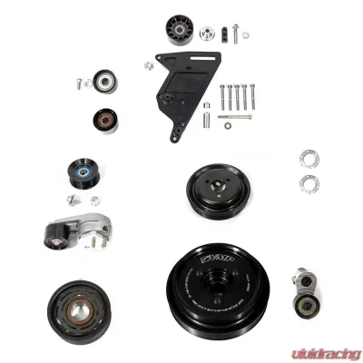 VMP 10-rib Full-FEAD kit for Gen3R Supercharged Coyote AC - 20% OD. This version is for front covers that have not been ground on. Also works with Roush and VMP 2.3 L blowers. If your front cover was previously ground you will need to purchase a "woAC" kit which includes the AC bypass bracket, you can later add AC by purchasing the AC pulley separately.