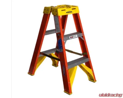 The T6203 Fiberglass 3-foot Twin Stepladder offers a high performance dual HolsterTop® with a paint and tool holder for convenience. The internal spreaders are heavy-duty and the slip-resistant Traction-Tred® steps are all double riveted and knee braced. These twin Stepladders allow 300 pounds per side making them ideal for one or two person jobs. The EDGE® molded brace and-foot pad combination provide bracing strength and increased protection against damage. Fiberglass rails are non-conductive for working near electricity.