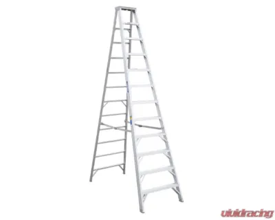 The 412 Aluminum 12-foot Step Ladder has a duty rating of 375 pounds and features heavy gauge Tool-Tra-Top™. All steps are knee braced and the Traction-Tred® steps are slip resistant. The rear rail is a full U channel and a full set of rear horizontals are spaced one per foot.