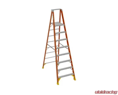The P6208 Fiberglass 8-foot Platform Ladder has a duty rating of 300 pounds and features a safety guardrail to encourage proper use. Back-up plates reinforce all top connectors and the large platform provides a secure and comfortable work area. The slip-resistant Traction-Tred® steps are double riveted and knee braced. A full set of rear horizontals are spaced one foot apart. The EDGE® molded brace and foot pad combination provides bracing strength and increased protection from damage. Fiberglass rails are non-conductive for working near electricity.
