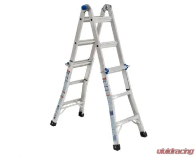 The light-weight MT-17 18-foot-reach Multi-Position Ladder is versatile and easy to transport. The adjustable telescoping design allows the ladder to be used in 5 different positions -- Twin Step Ladder, Stairway Step Ladder, Extension Ladder, Wall Ladder and as 2 Scaffold Bases. In the Step Ladder mode, this hybrid ladder can be used for one - or two-person jobs with a duty rating of 300 pounds per side. The feet are slip-resistant, and the ends of the multi-position ladder are flared for firm support. Smooth, curved rails allow for comfortable climbing. With its many uses, this multi-position ladder fits all your climbing needs.