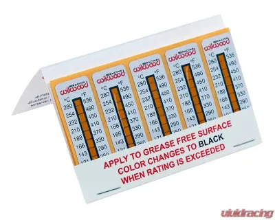 Wilwood's Temperature Strips provide an easy, accurate, and affordable method of recording observed on-track temperatures of brake calipers or other components on a race car. The adhesive-backed strips can be attached to any clean, smooth surface to record peak temperatures that occur during sessions. The temperatures are marked for both Fahrenheit and Celsius with the range of 250° to 536° F and 121° to 280° C. The indicator color changes to black when a new, or higher temperature level is observed. Each package includes 10 non-movable strips.