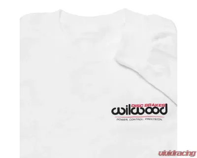 A Wilwood Disk Brakes white cotton t-shirt with long sleeves features the famous brand logo and line Power, Control, Precision on the front, and back. Tradition-style jersey knit with ribbed collar.