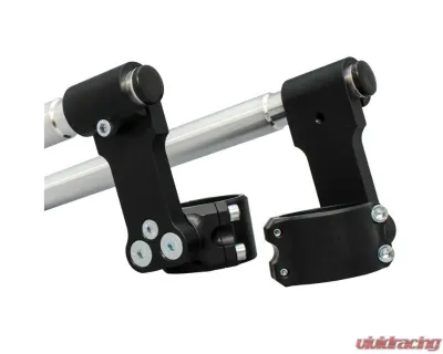 Woodcraft 3-piece split clipon risers are specially designed to make installation and removal a snap. Our 3-piece design is race proven and makes it easy to service your clipons below the triple clamp without having to disassemble the entire front end. Special attention has also been taken to save weight wherever possible on these clamps. The bars themselves are 12 inches long and are easily adjusted to whatever custom width you desire. Racers no longer have to worry about replacing an expensive complete clipon assembly after a crash - these risers use an inexpensive universal handlebar.